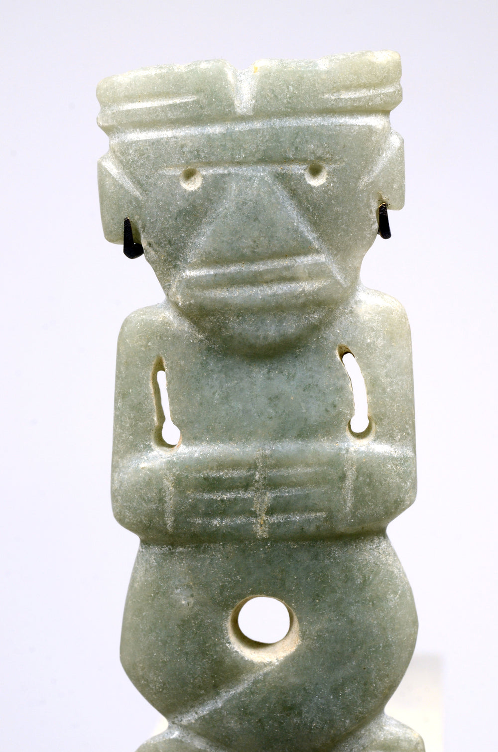Each outer rider’s lower body transforms into a coiled, banded serpent, creating a hybrid human‑snake being; serpent forms are frequent in southeastern Nigerian masquerades, signaling power, medicine, and dangerous protective force.