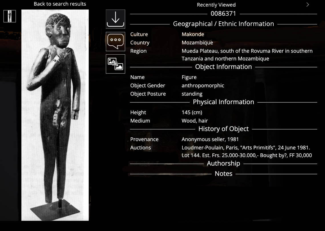 Yale archive # 0086371 and although here it's labeled Makonde, this attribution can be excluded as the figure lacks the finely carved ebony, compact scale, scarification motifs, and shetani or ujamaa iconographies that characterize Makonde sculpture, and instead conforms to the rough-hewn, large-scale Sukuma/Nyamwezi mabinda type.