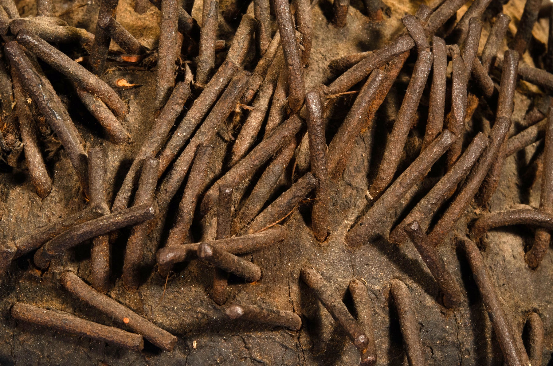 Scholarly and field accounts describe such large, roughly modeled figures as mabinda (also ibinda), created by Sukuma carvers for use in competitive dry‑season dance societies. Articulated arms allowed the performer to manipulate the figure in front of the crowd, transforming it into a powerful “actor” that intensified spectacle, attracted audiences, and advertised the potency of the sponsoring healer or troupe. The present example’s near life‑size scale (147 cm), articulated limbs, rough-hewn yet imposing body, and thick sacrificial surface place it securely within this corpus and argue for a Sukuma attribution. Closely related Nyamwezi statuary tends to favor inset beaded eyes and more polished surfaces, features absent here, further supporting the identification of this work as a Sukuma mabinda figure rather than a Nyamwezi ancestor image