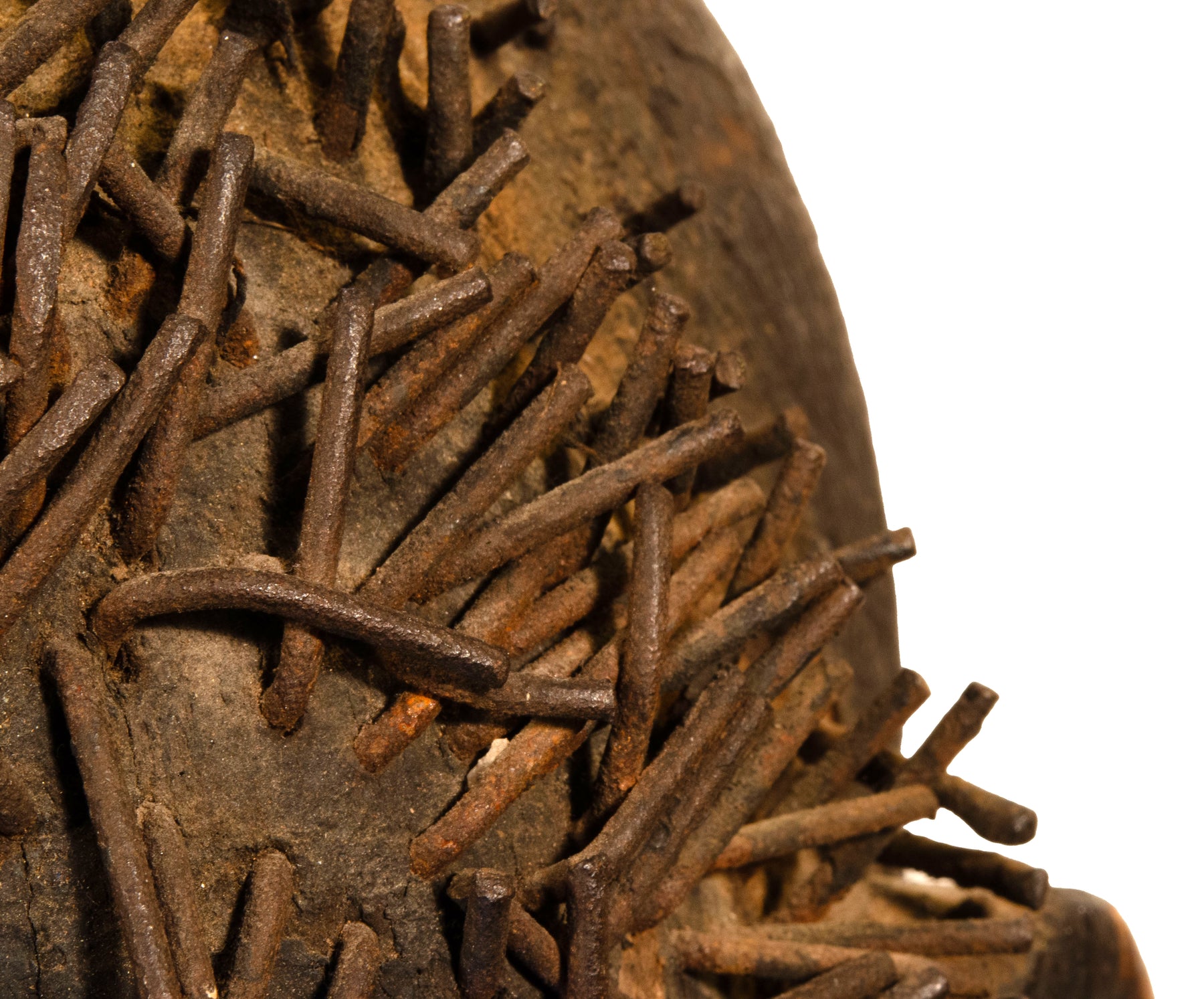 Large standing figure (mabinda) with articulated arms, carved from a single tree trunk and covered with a dense, crusted dark patina. The attenuated, columnar body, narrow sloping shoulders, and small feet form a compact vertical mass, from which the long arms are pegged at the shoulders; the right arm is bent dramatically so that the hand touches the neck, while the left hangs close to the flank. The slightly oversized head is capped with a low domed coiffure rendered as a thick carpet of individually inserted wooden pegs, enhancing the figure’s animated presence and recalling the heightened theatricality valued in Sukuma dance sculpture. Extensive sacrificial accretions, burning, and age cracks testify to prolonged ritual use.