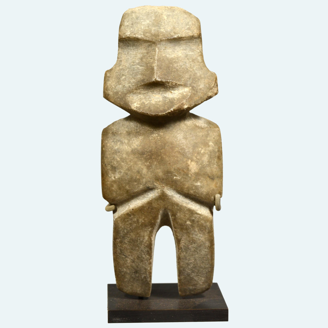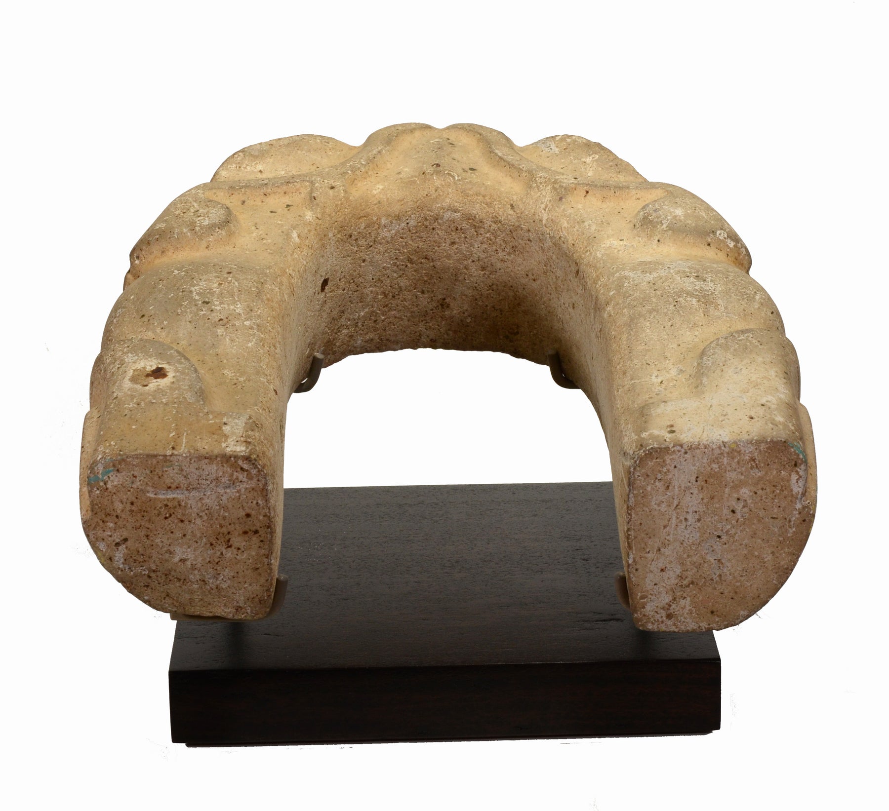 This finely worked Veracruz yoke is vigorously carved in the form a toad head, disposed horizontally in the traditional yoke shape. The creature's broad head with an elongated mouth and prominent eyes and carefully indicated parotid glands behind the eyes. The smooth, dense cream color stone is crisply cut, the contours of the features rendered with depth and bold assurance.