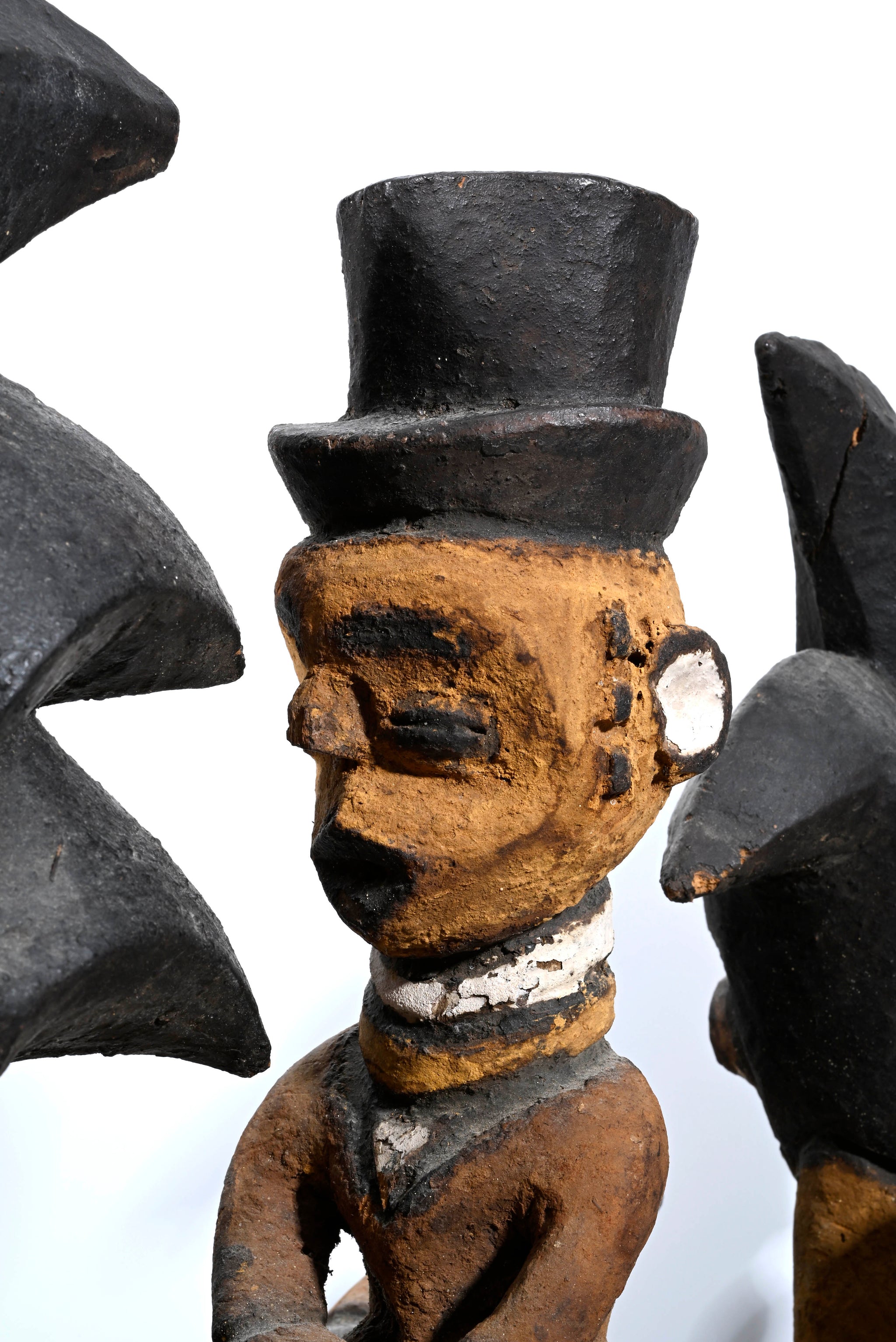 The composition shows two powerful male (or possibly spirit) riders with tall tripartite crests flanking a central, smaller figure in a European top hat; such hats are widely used in Nigerian mask carving to reference colonial or elite status, modernity, or satire.