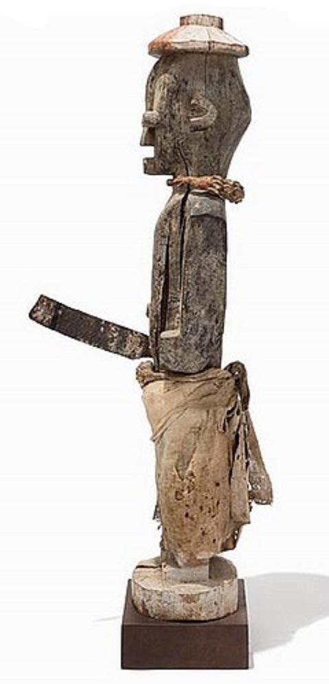 Standing male figure with arms to sides and with cowrie (Cypraea moneta) shells attached to the skirt and as a necklace; he wears a cap and has iron knife yielding from waist; inlaid mica eyes.