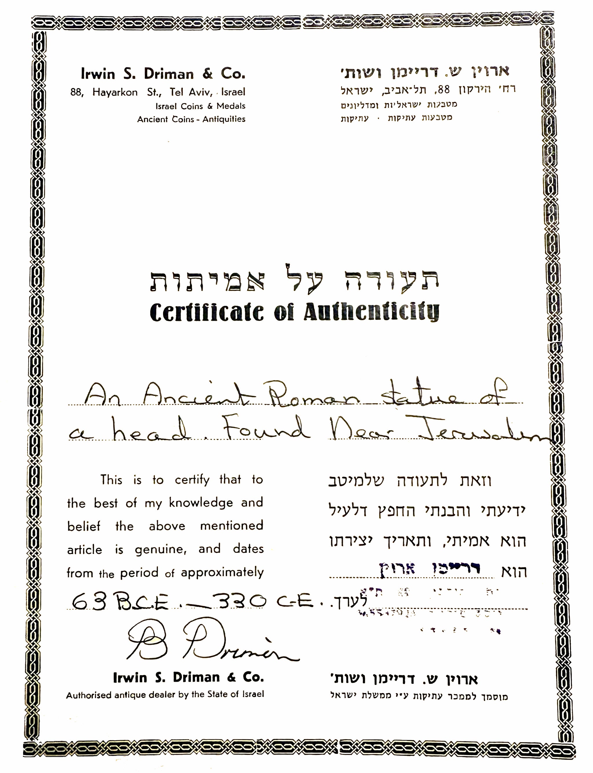 Provenance: Private Y collection, Acquired in Israel 2000 and accompanied by a copy of older certificate from Irwin S. Driman & Co., Tel Aviv.