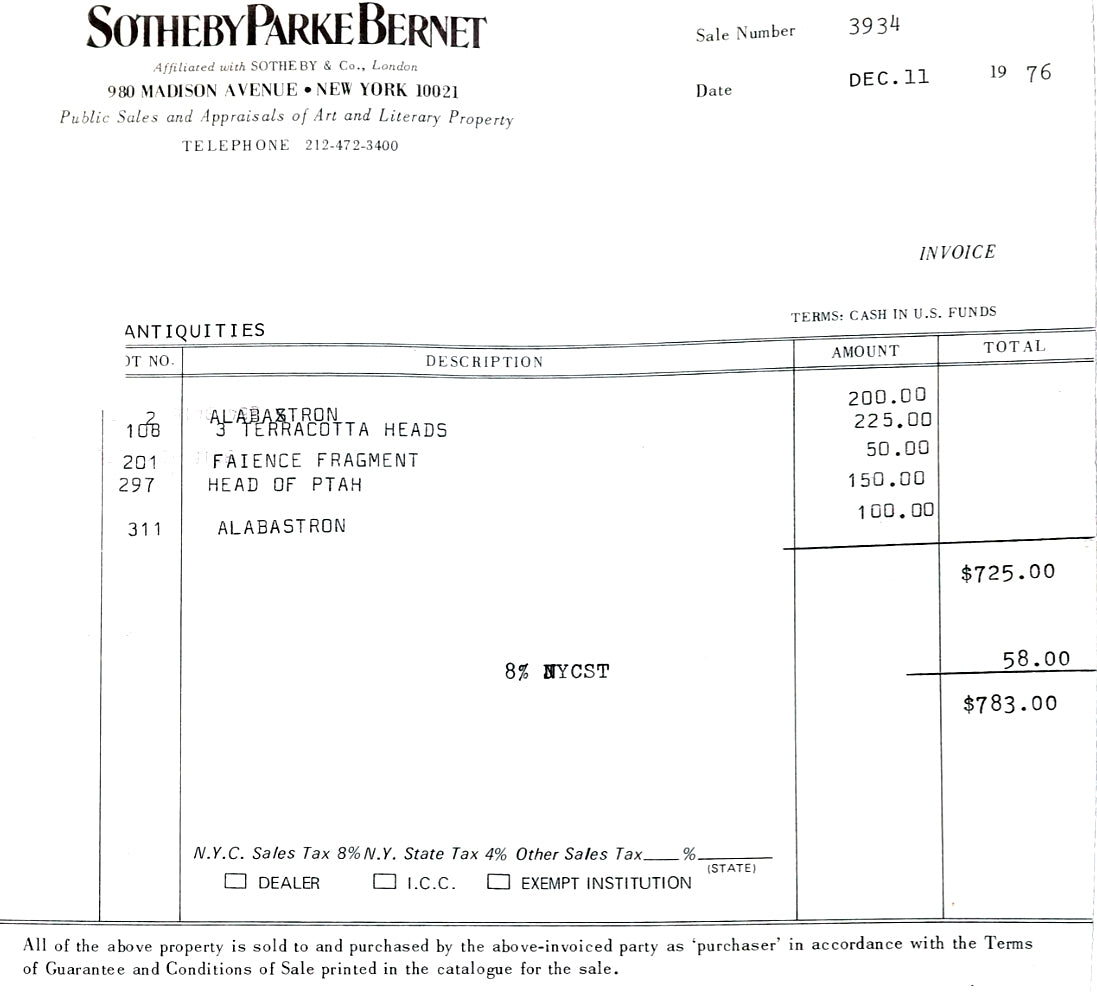 Provenance: Property of a New York City collection. Acquired at Sotheby Parke Bernet, New York, Antiquities sale, 11 December 1976, sale 3934, lot 297 (with original auction number sticker “3934” to the back of the head, lot string tag and old inventory label to underside of socle); copy of original invoice accompanies the piece.