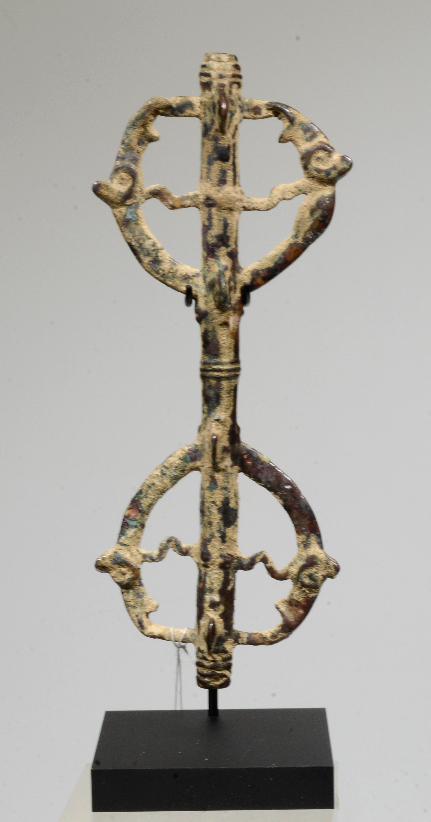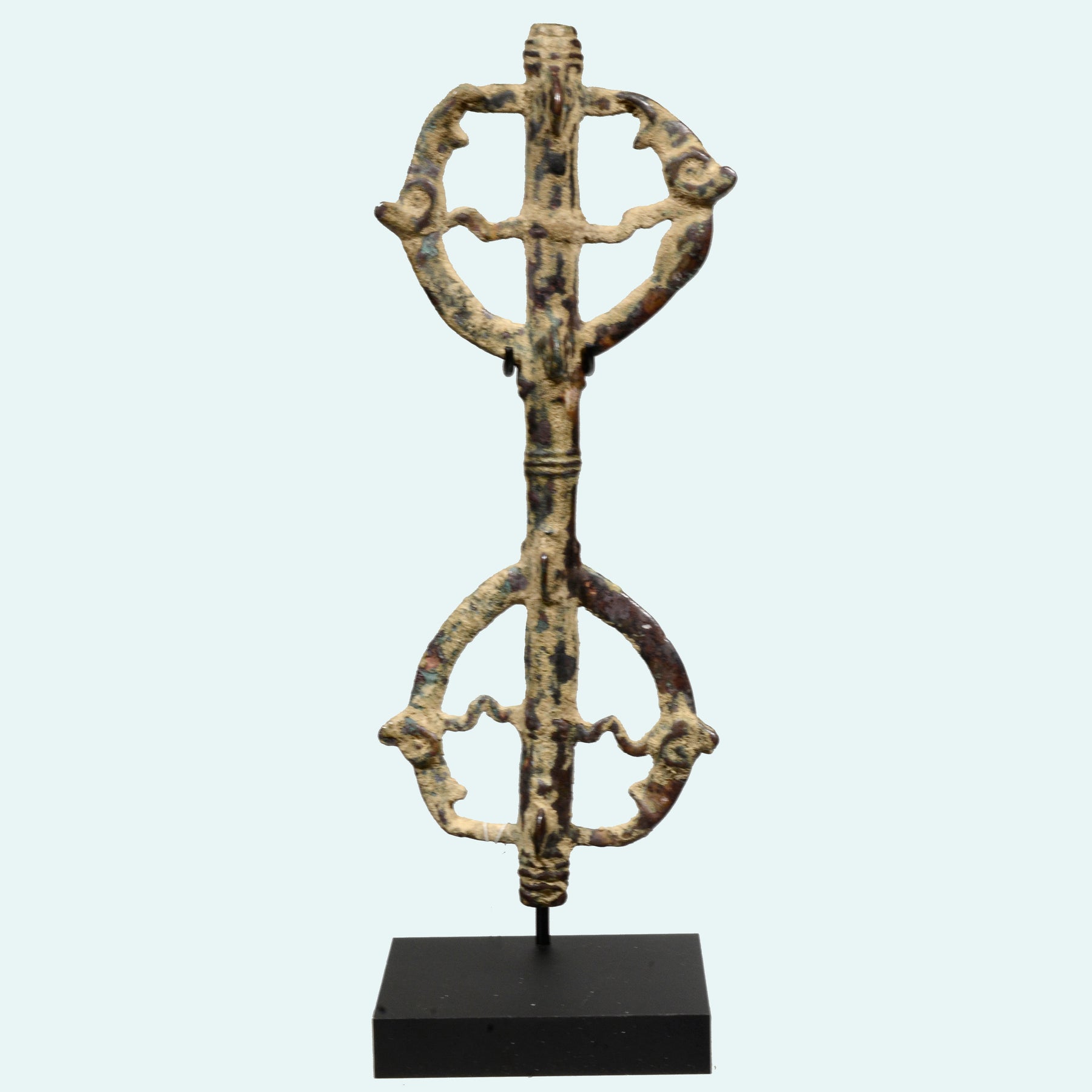 A "Master of the Animals", Luristan type cast attachment which is double sided and front and back janiform featuring a central figure flanked by animals which he holds at the neck. Each face features prominent nose, button eyes and slit mouth. Bars project from both sides of the head and are attached to the snouts. The composition is balanced and repeats on the opposite end.