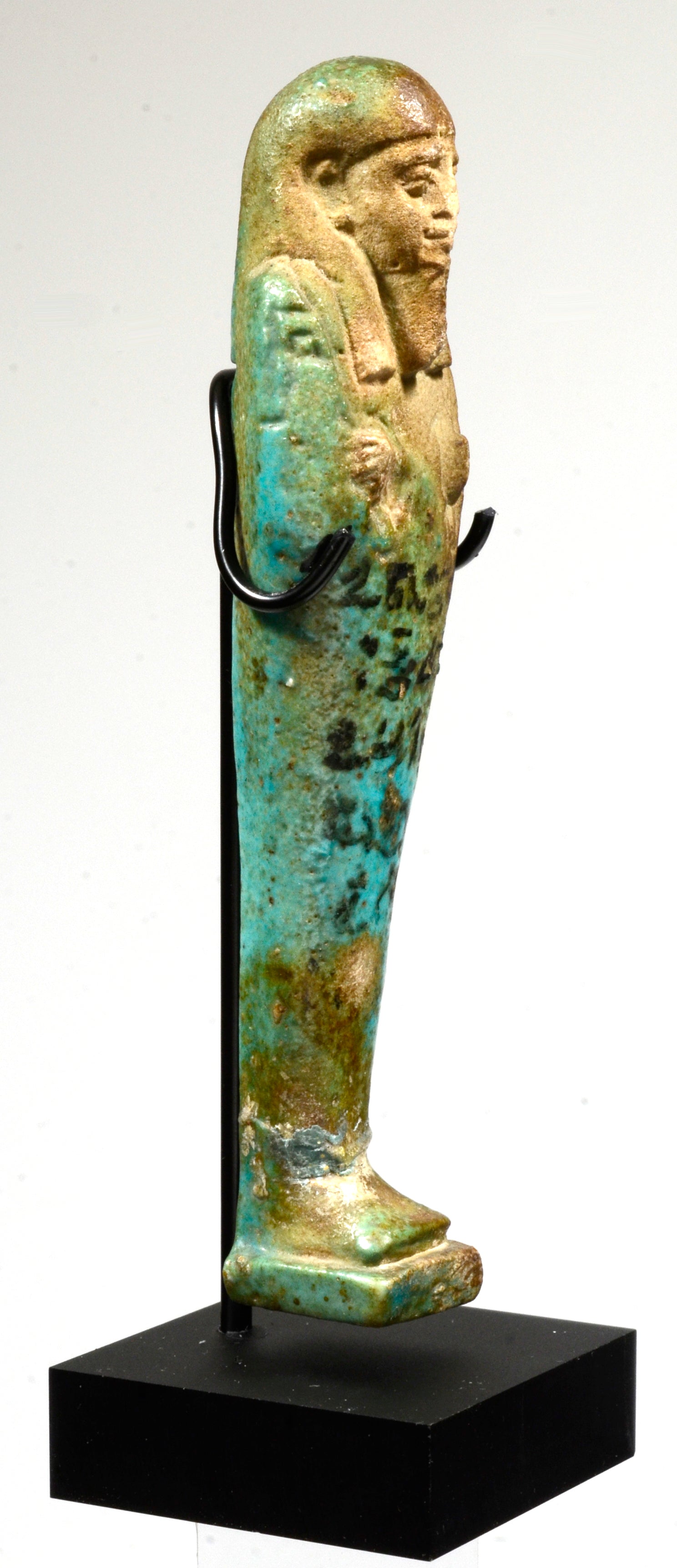 A green glaze standing servant figure with arms crossed and holding agricultural implements and face with triparte wig and long beard. Front is inscribed in black ink in multiple rows in a hieratic (cursive) inscription instead of a hieroglyphic one. It begins “O you shabti ...” and the rest is  probably the usual spell or, more likely, an abridged version of the spell.