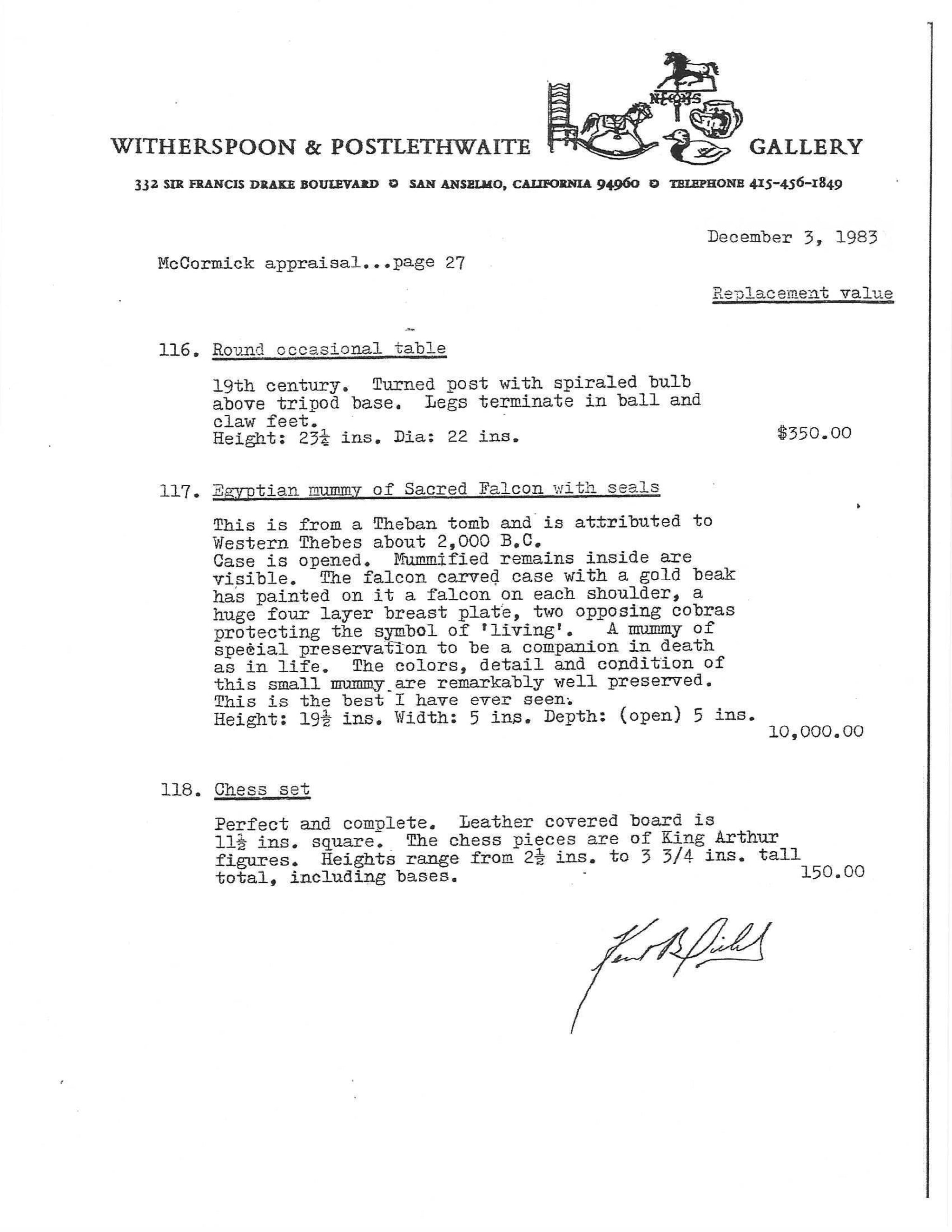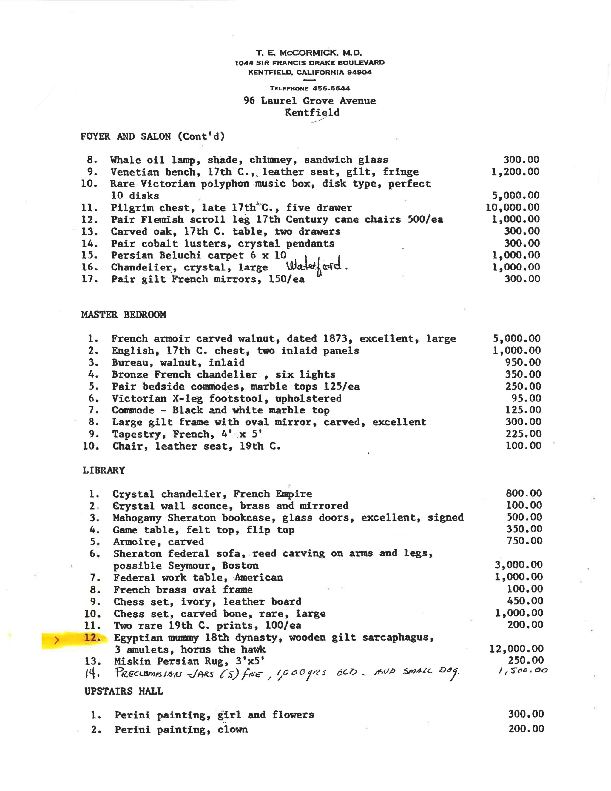 Provenance:  with copies of appraisal dated December 3, 1983 by Witherspoon & Postlethwaite, San Anselmo, California; and another dated September 20, 1974 by T.E. McCormick 1044 Sir Francis Drake Boulevard, Kentfield, California