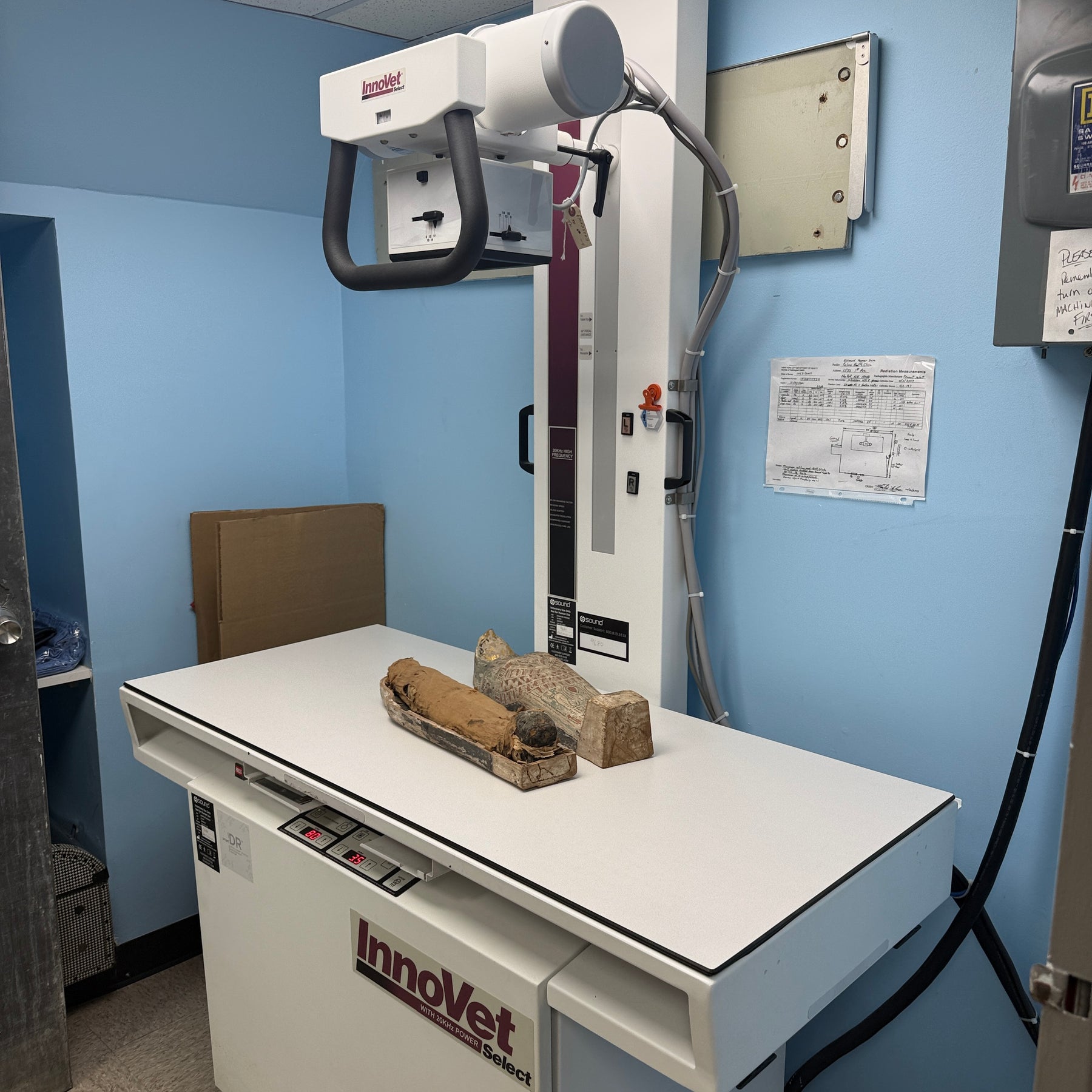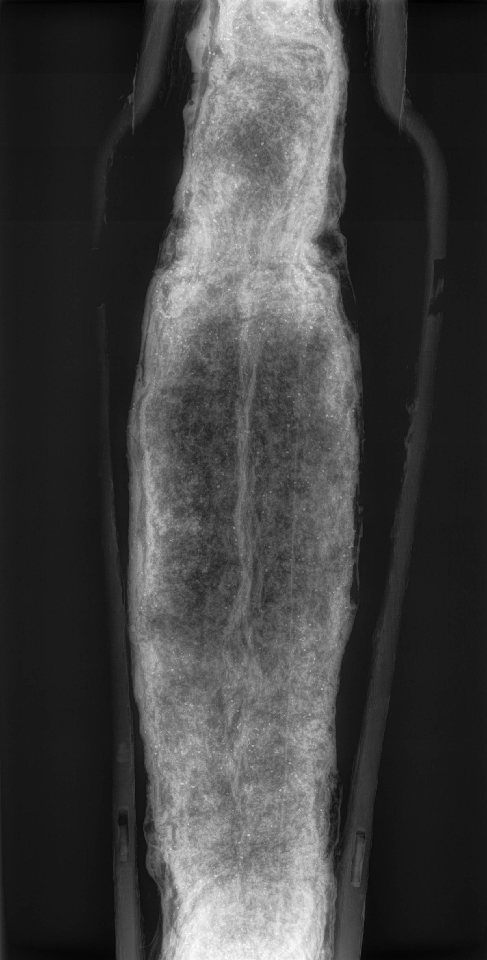 This falcon-headed coffin does not contain an actual mummy but a symbolic Osiris mummy. Although appearing to be a mummified animal, the image of the deity is composed rather of clay and grain wrapped in linen. The falcon head on the coffin and the hieroglyphic text on the painted lid indicate it is associated with the funerary deity Ptah-Sokar-Osiris. Inscription nmya start with “ Words spoken by the Osiris ...