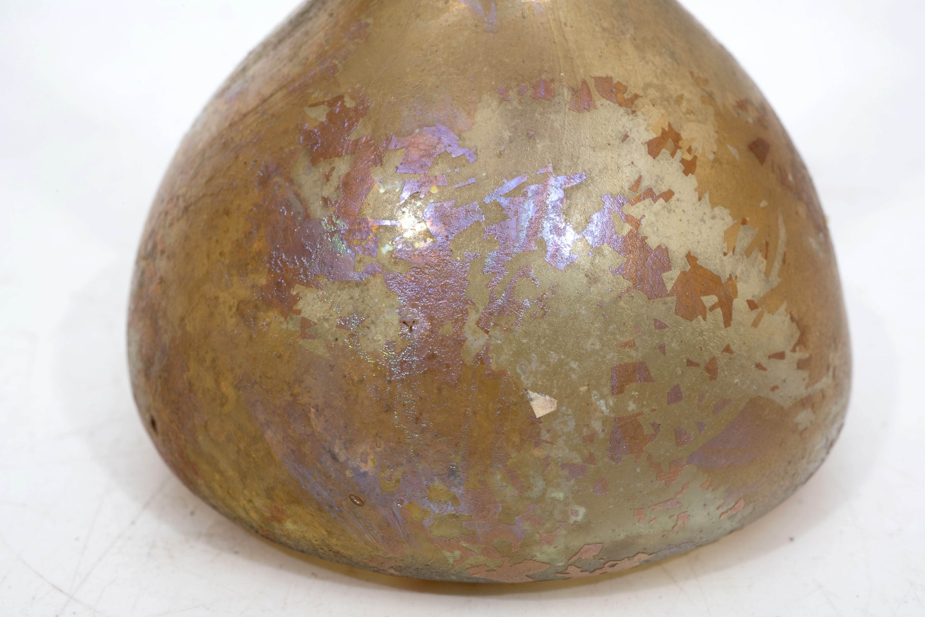 A pale green blown-glass bottle with bell-shaped body, tall slender neck and out-turned folded rim, intact with attractive iridescent and earthen patina from long burial.