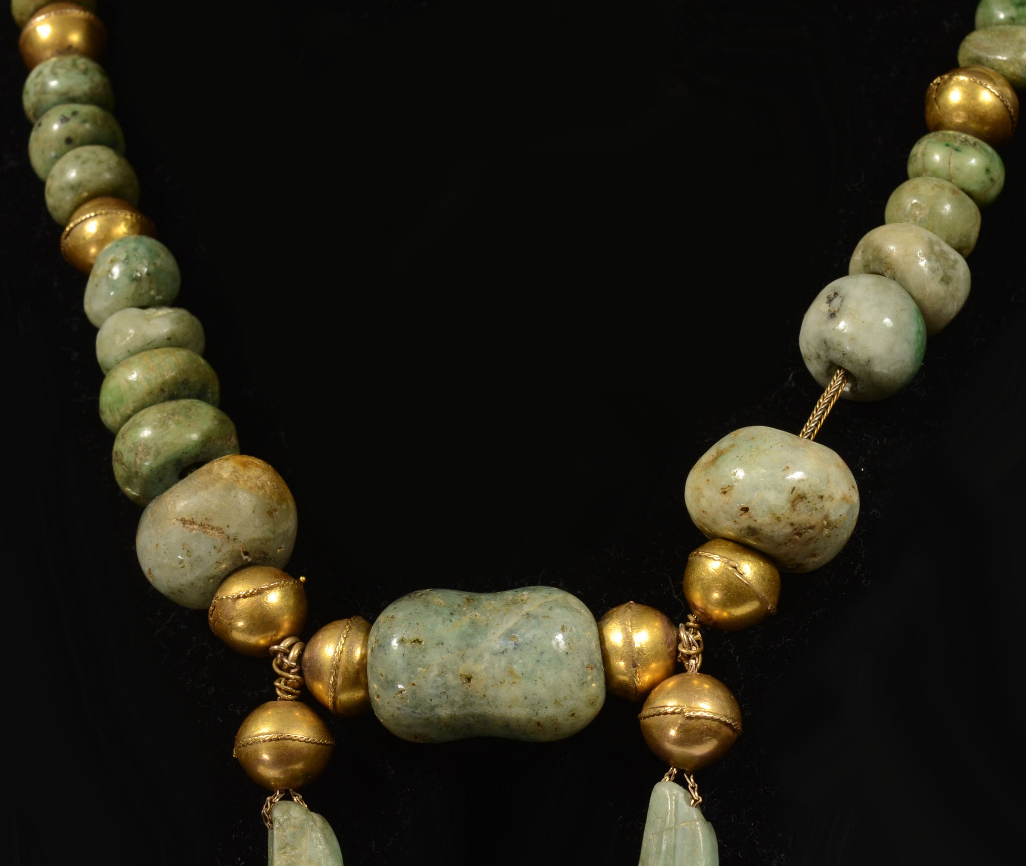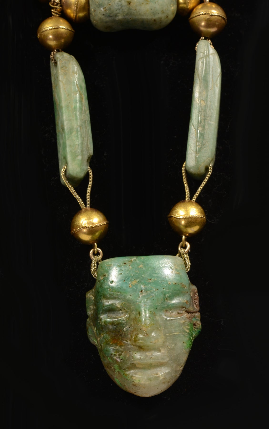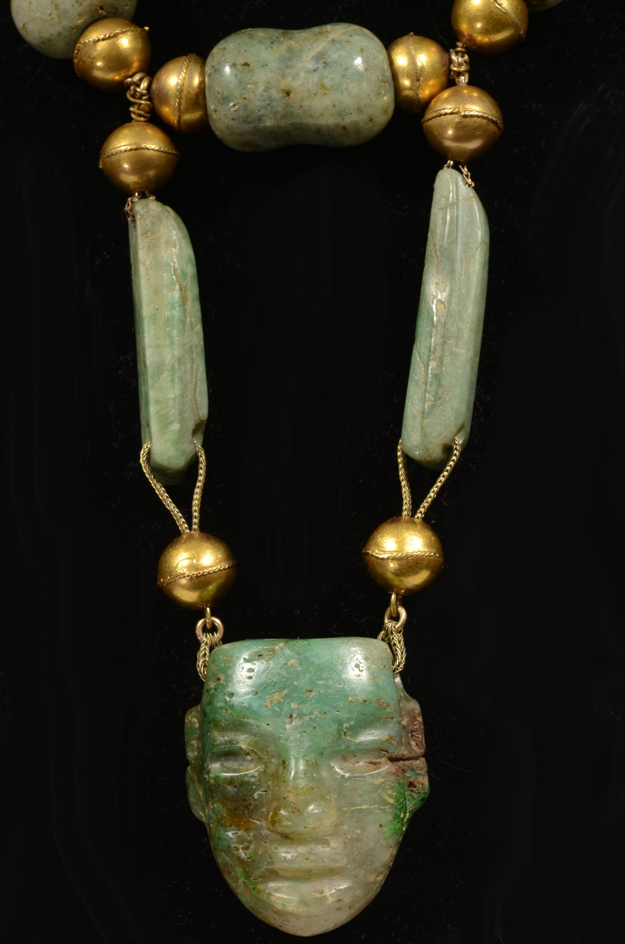 Imposing and showy chunky necklace composed of two piece hollow construction 10k gold ball beads, pierced and interspersed with various jade and greenstone polished tube and barrel shaped beads, all suspended on a woven link chain. The focal pint is a suspended cross bar and a drop down Maya or Teo fuchsite hanging masket as a pendant.
