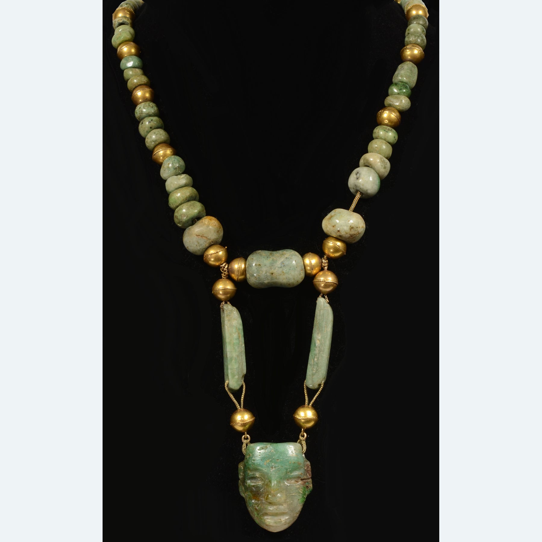 Mayan Gold and Stone Bead and Masket Pendant Necklace