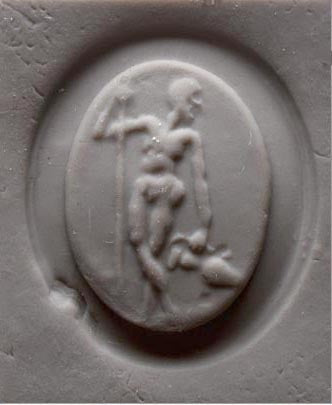 Heavy solid gold finger ring with a tapered shank terminating with two stylized feline heads with open toothy mouths, biting the shank. Large oval bezel decorated with a standing nude figure, legs crossed and holding a long staff and an amphora.