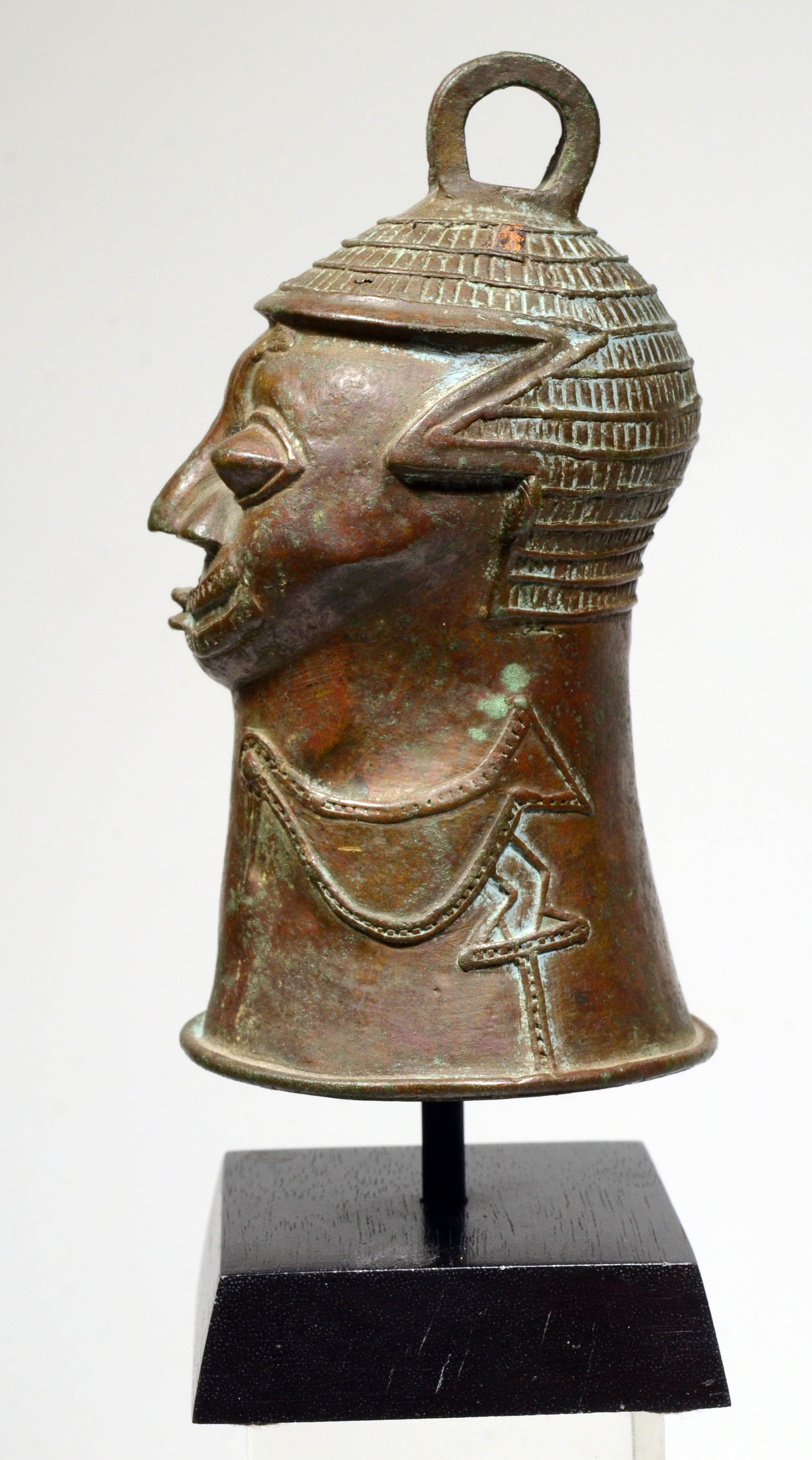 Cast Yoruba-Ijebu bronze bell, typically used in ritual or ceremonial contexts in West Africa, specifically among the Yoruba people of Nigeria relating to Egungun, Ifa divination or Shango. The bell is conical in shape with an elaborate anthropomorphic head at the top, including stylized facial features and a loop for suspension. The lower surface is adorned with raised geometric motifs and dotted patterns, often signifying status, spiritual power, or lineage.