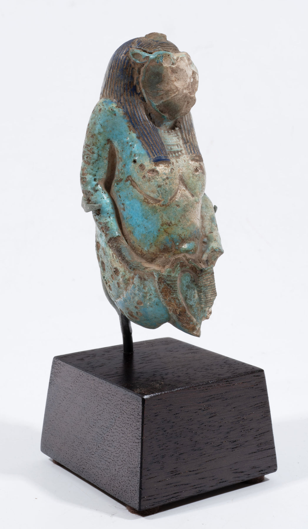 A good-quality but heavily damaged bichrome fragmented statuette of the pregnant hippopotamus goddess, patroness of pregnancy and protector of families.  Fine modelling of the pendulous breasts,  hands to swollen belly and forward stride is well executed; surviving glaze is rich, though pitted and worn from burial. Beautiful dark blue wig and lighter green body colors.