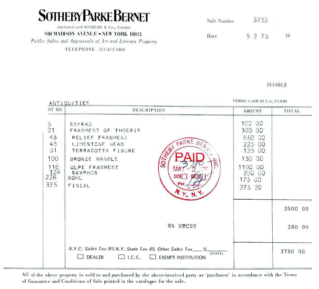 All pieces are unconditionally guaranteed authentic and as described in perpetuity and have been legally acquired and imported in full accordance with U.S. and applicable foreign regulations regarding the movement and sale of antiquities.