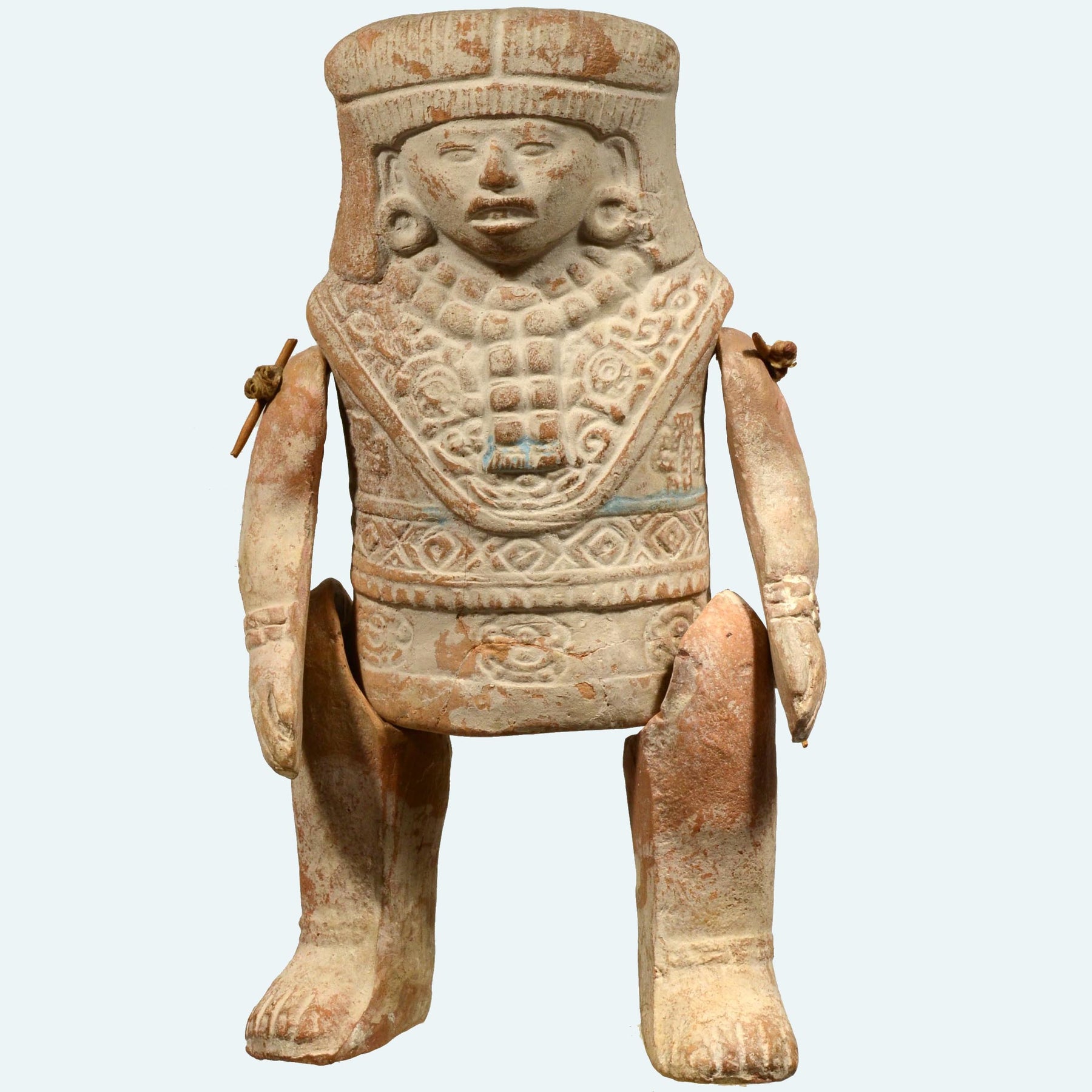 Molded pottery articulated figure, composed of five separately cast pieces, arms, legs and body. Having a long striated hairdo, with ear spools. Wearing a wide fancy decorated collar, long beaded necklace and fancy relief decorated shirt. Some remaining white slip surface pigment with a few traces of blue highlights.
