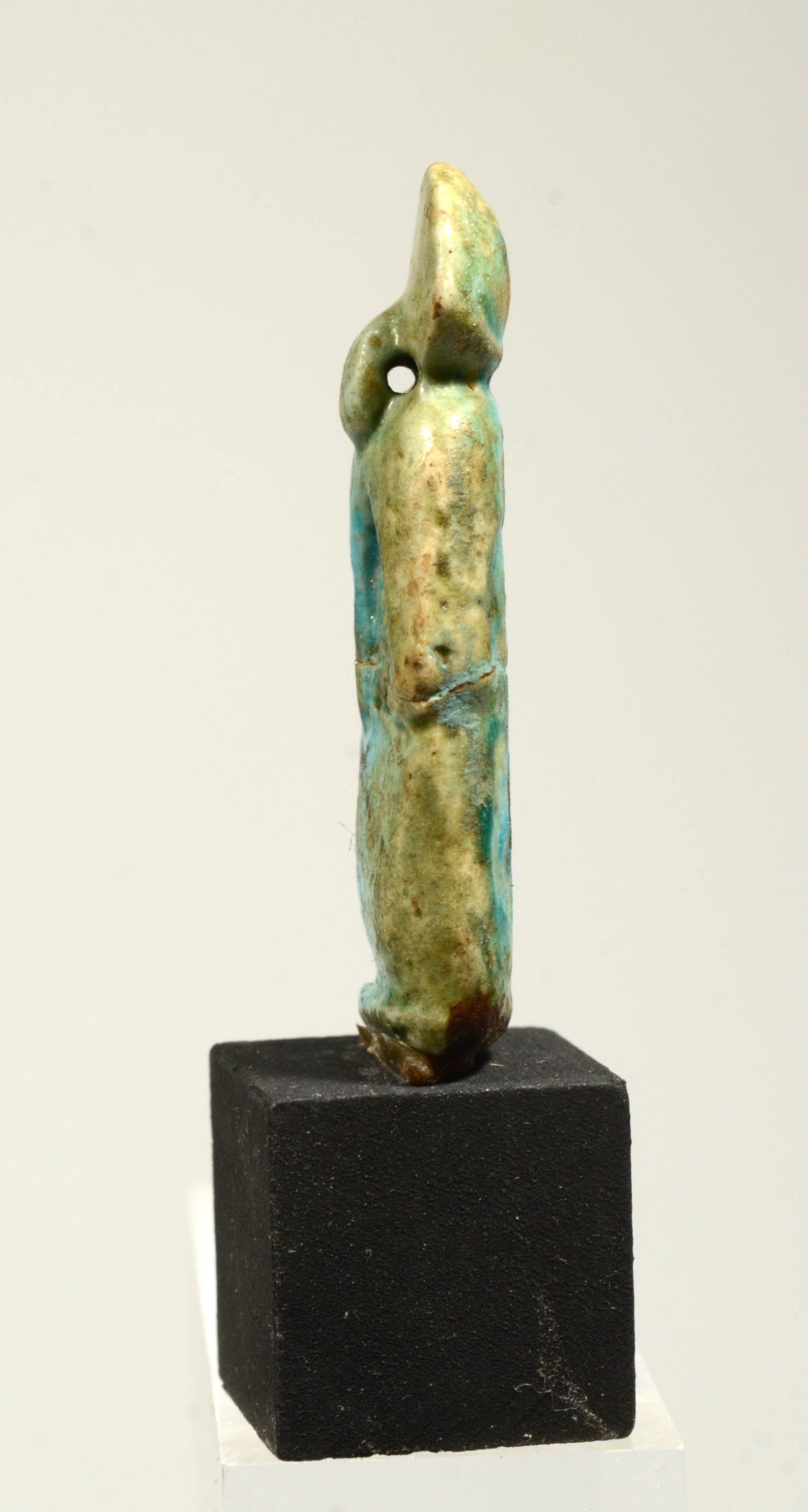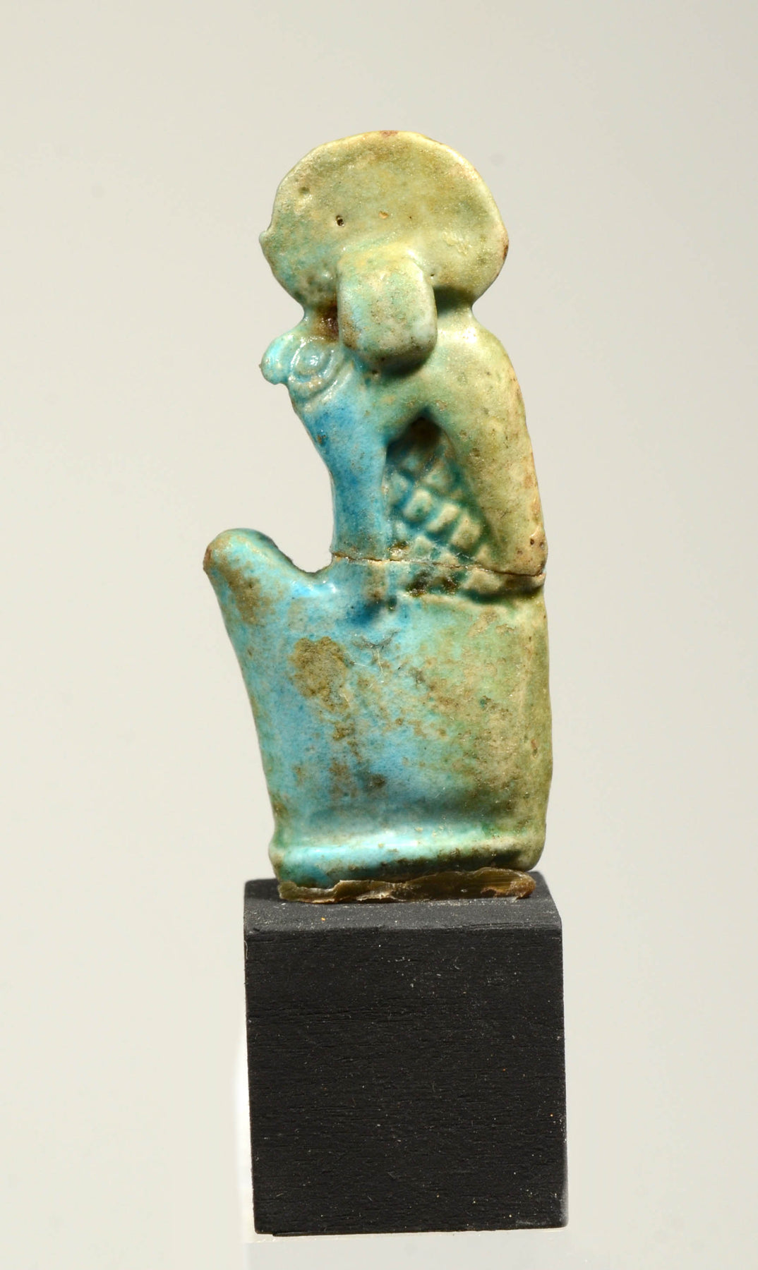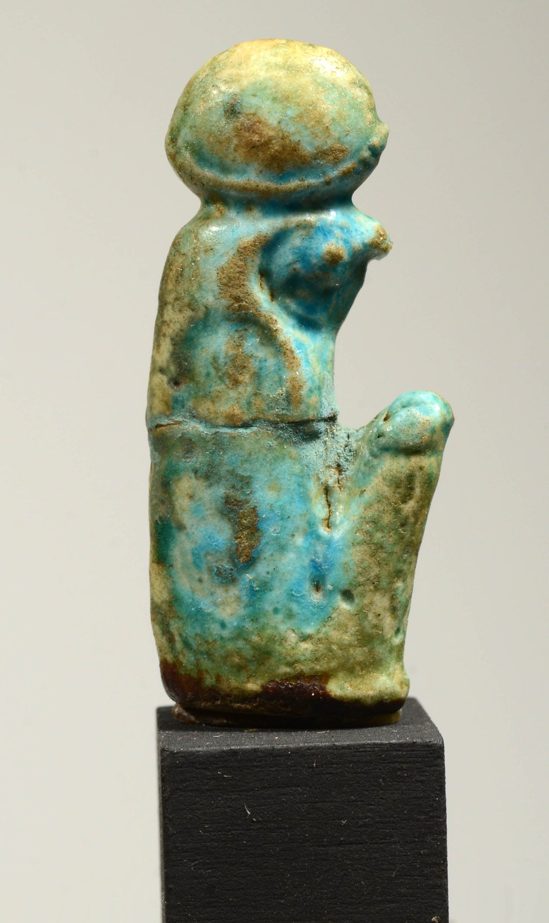 A blue amulet in the form of the god Ra-Horakhty seated in profile with knees raised up and wearing a sun disc atop head;  small loop on one side of his head so it could be worn for protection.